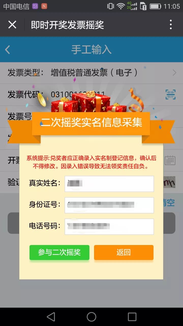参加即开兑奖后,需根据提示信息填写内容方能参加二次摇奖↓